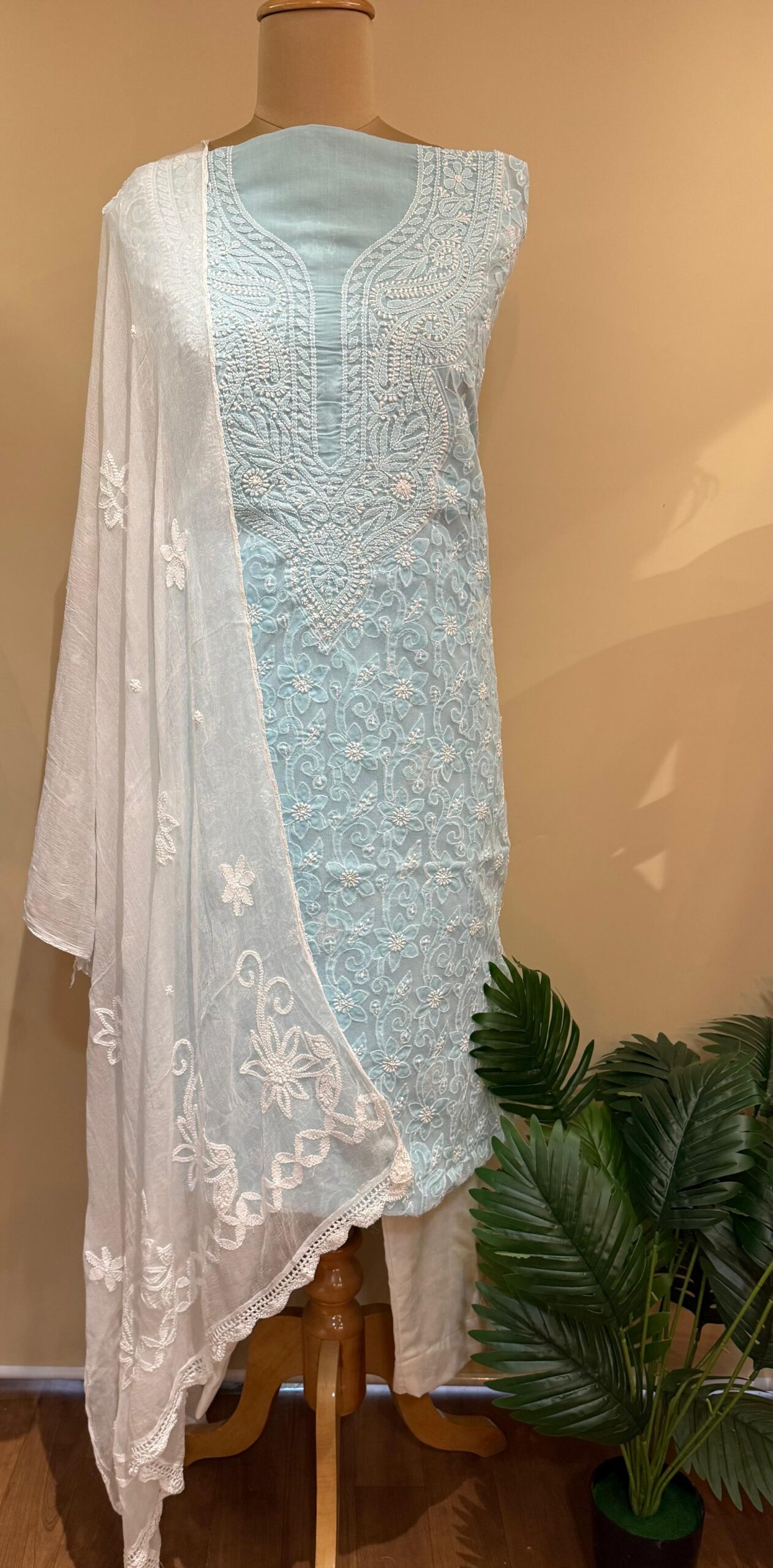 Graceful pastel appliqué Luckhnowi kurta pc, adorned with intricate white thread embroidery on the kurta, showcasing delicate floral and paisley patterns. Paired with a soft white dupatta featuring elegant embroidered motifs and scalloped edging. A soothing and refined choice for daytime functions or summer gatherings.