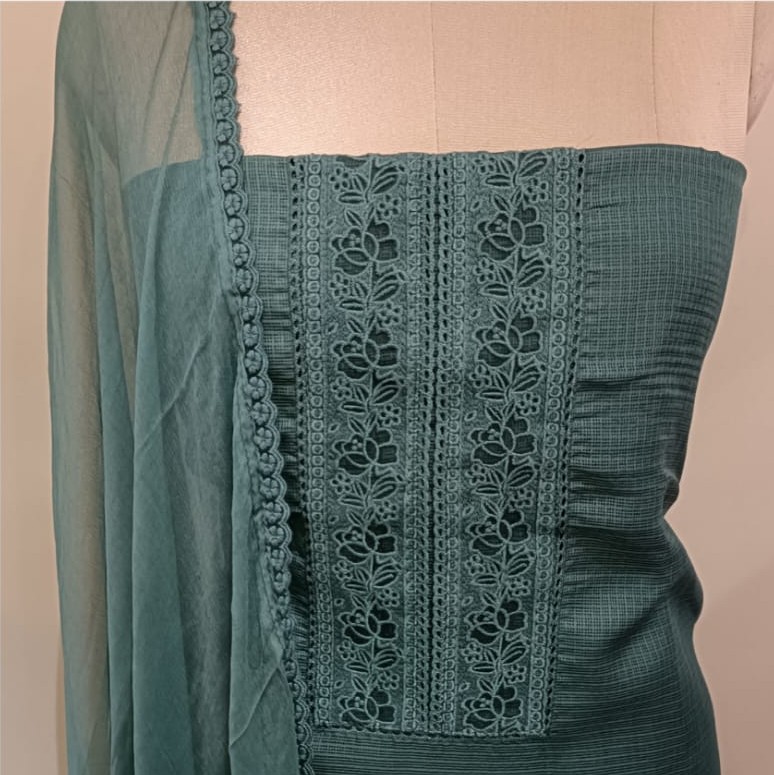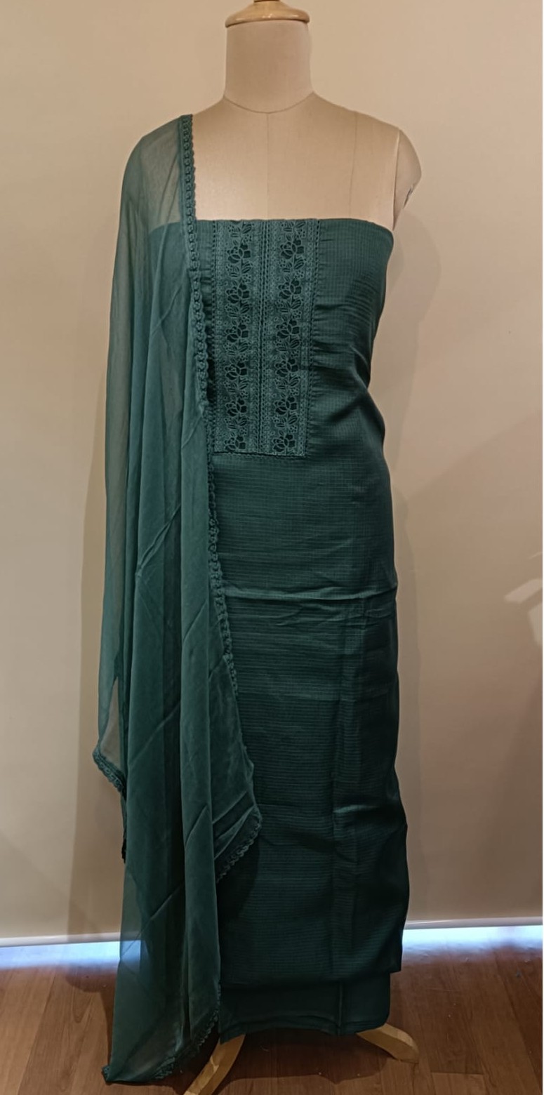 + ShippingBeautiful emerald green Kota fabric with a front self-embossed yoke, along with a chiffon dupatta featuring four-sided lace and plain pants fabrics.