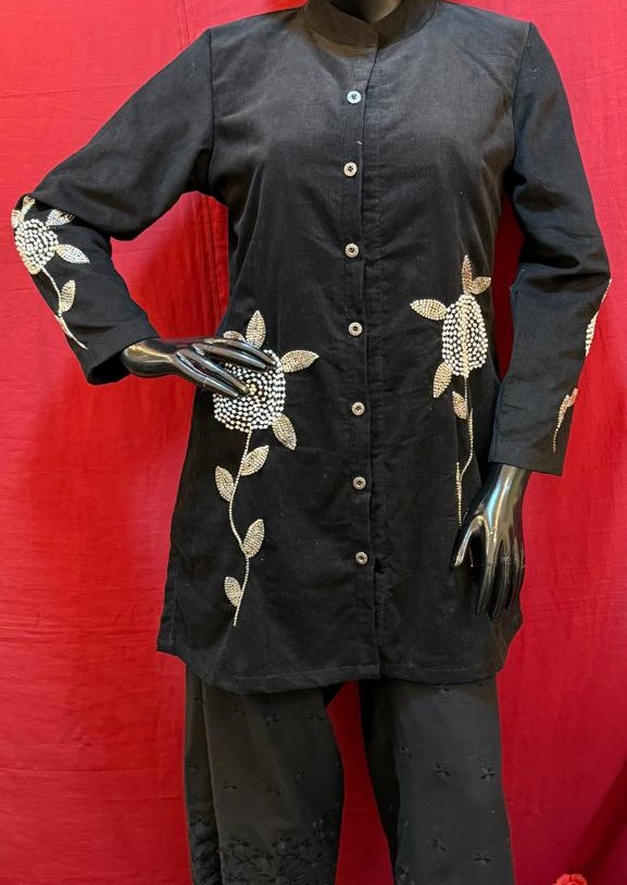 Long Black codroy jacket with lovely bead work in offwhite n gold in front n sleeves alongwith front metal buttons.