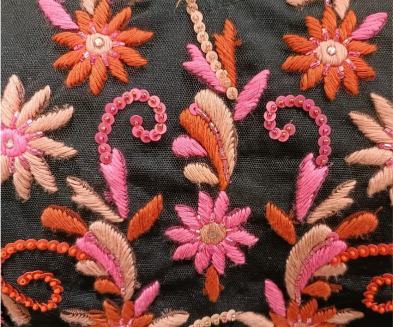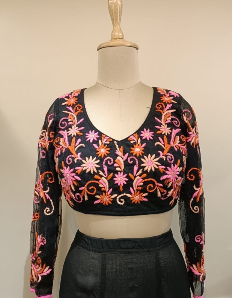 Black net blouse with vibrant floral embroidery in pink, orange, and peach tones, featuring full sleeves and a deep neckline for an elegant, festive look.