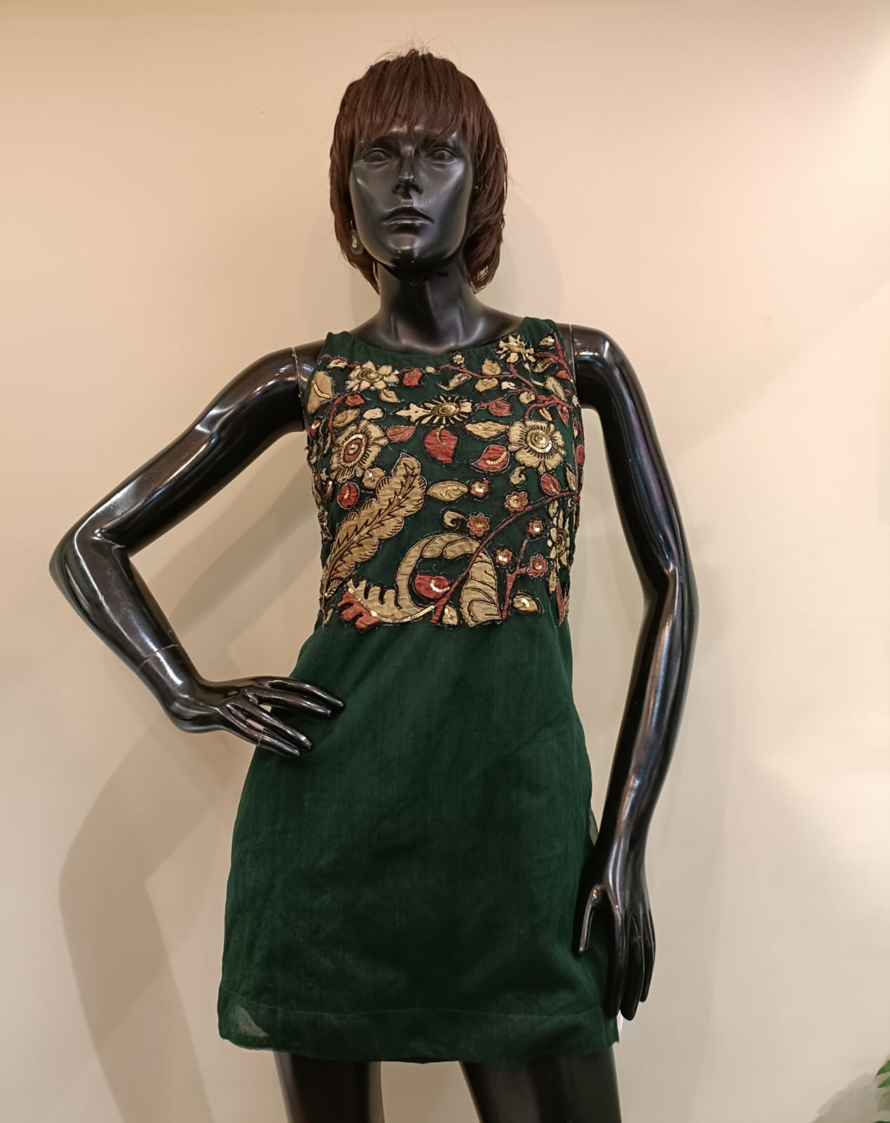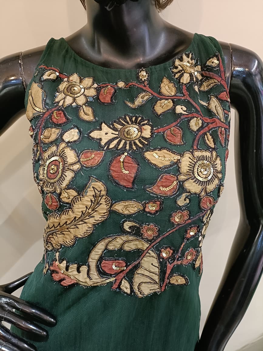 + ShippingThis elegant green net top is adorned with Kalamkari fabric appliqué, delicately highlighted with sequins and thread embroidery, creating a graceful fusion of timeless artistry and modern sophistication.
