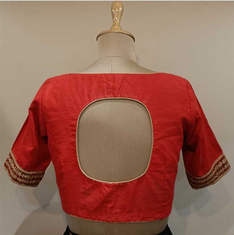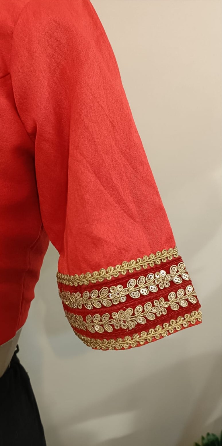 + ShippingElegant red blouse with a square back cut-out, highlighted with gold gota detailing on the sleeves. Features a stylish sweetheart neckline and elbow-length sleeves, perfect for festive and traditional wear.