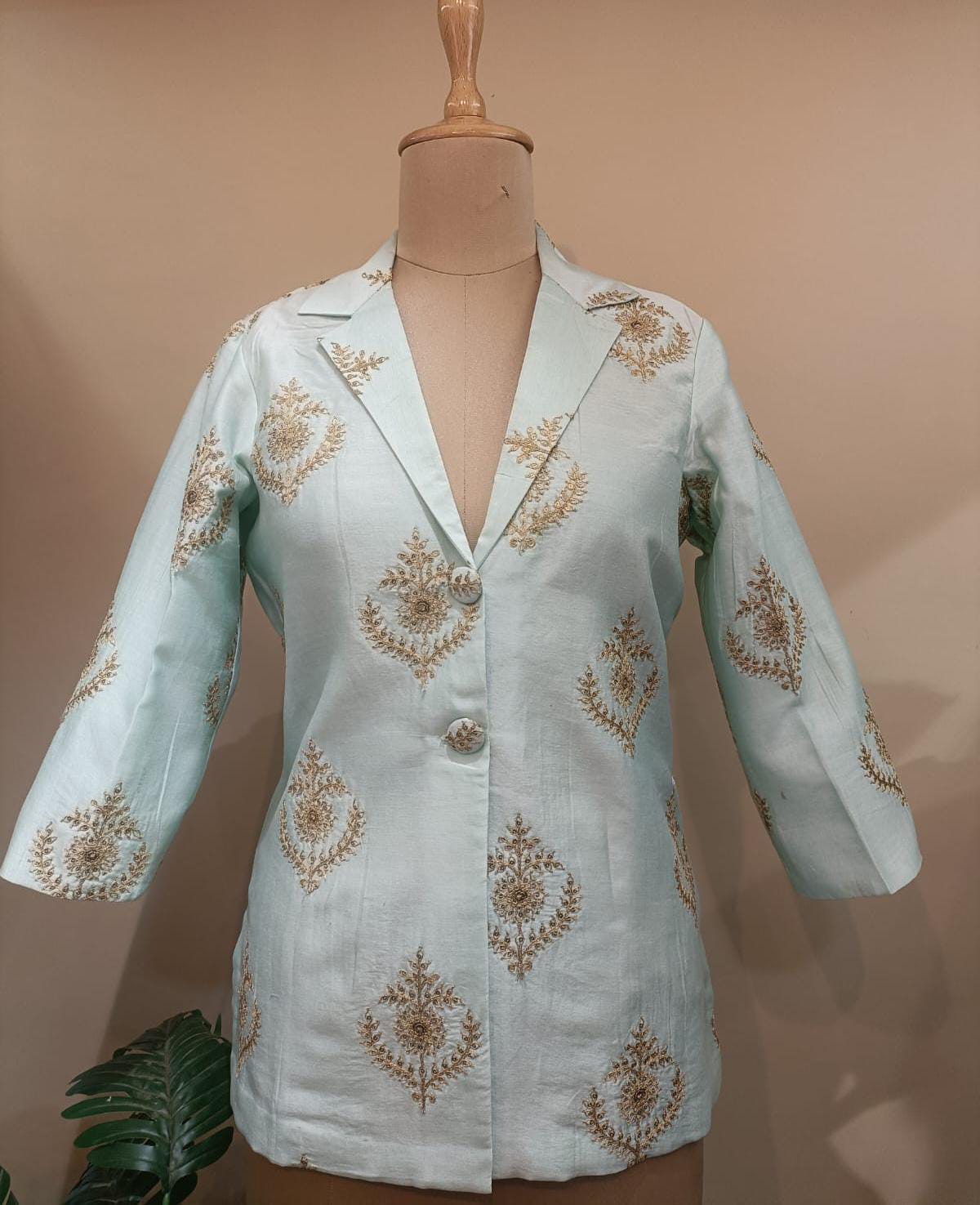 Jacket in soft aqua blue, adorned with subtle gold block-print motifs