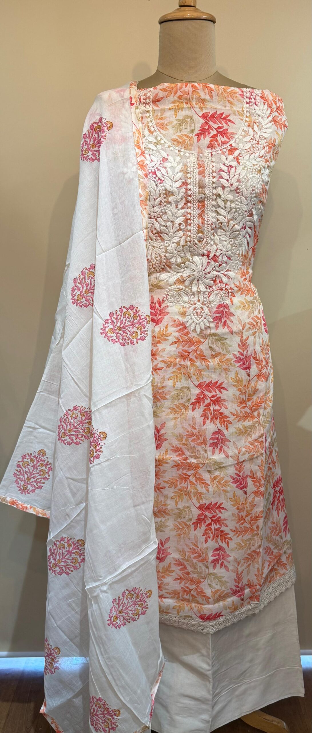 + ShippingLucknowi style printed soft cotton kurta with front embroidery along with block print Dupatta and white pant.