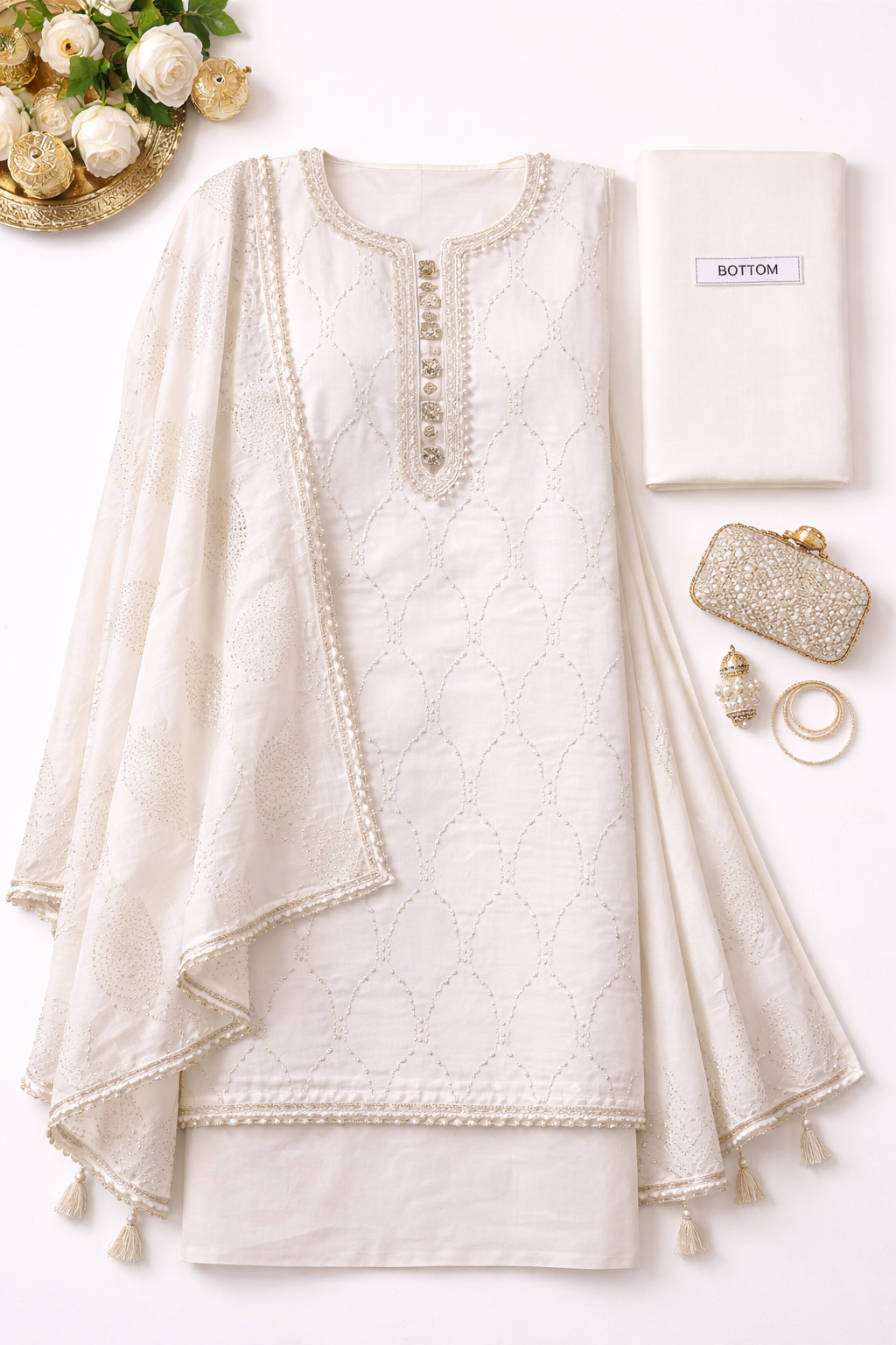 Elegant off-white cotton chikankari suit set, beautifully detailed with mirror and lace highlights, paired with a matching dupatta and cream plain pants for a graceful and timeless look.