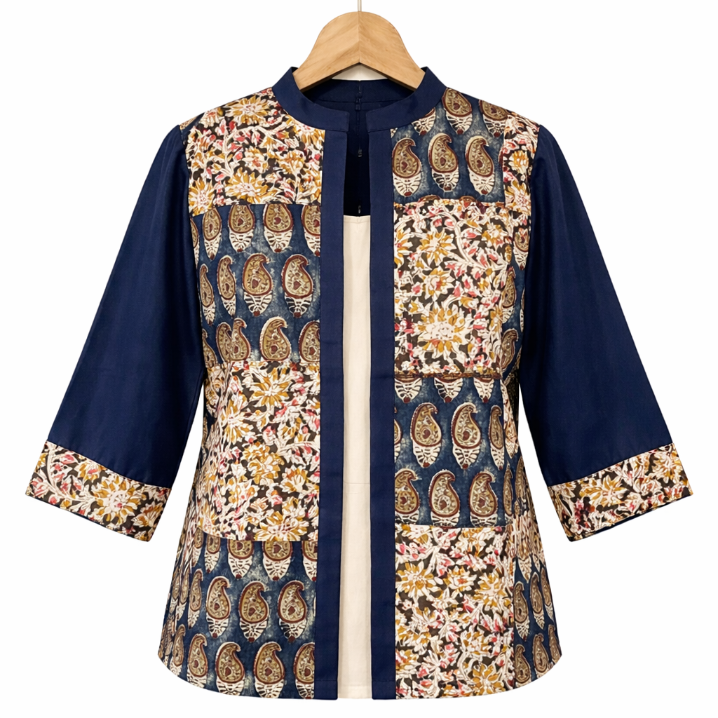 + ShippingA smart patchwork cotton jacket featuring a mix of floral and paisley prints in deep indigo tones. Designed with a mandarin collar, open front, and three-quarter sleeves with contrast cuffs—perfect for effortless layering over kurtas or dresses.