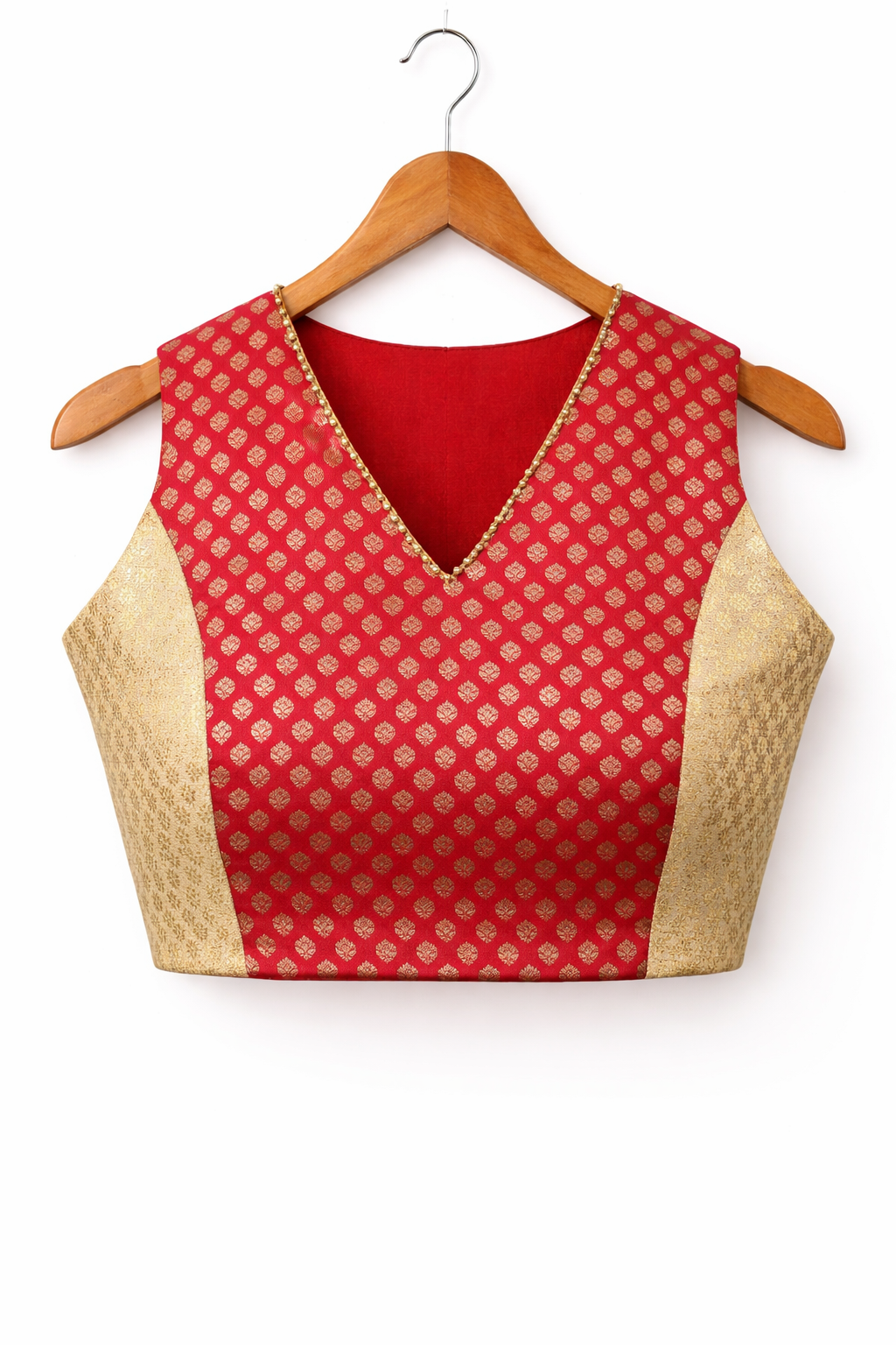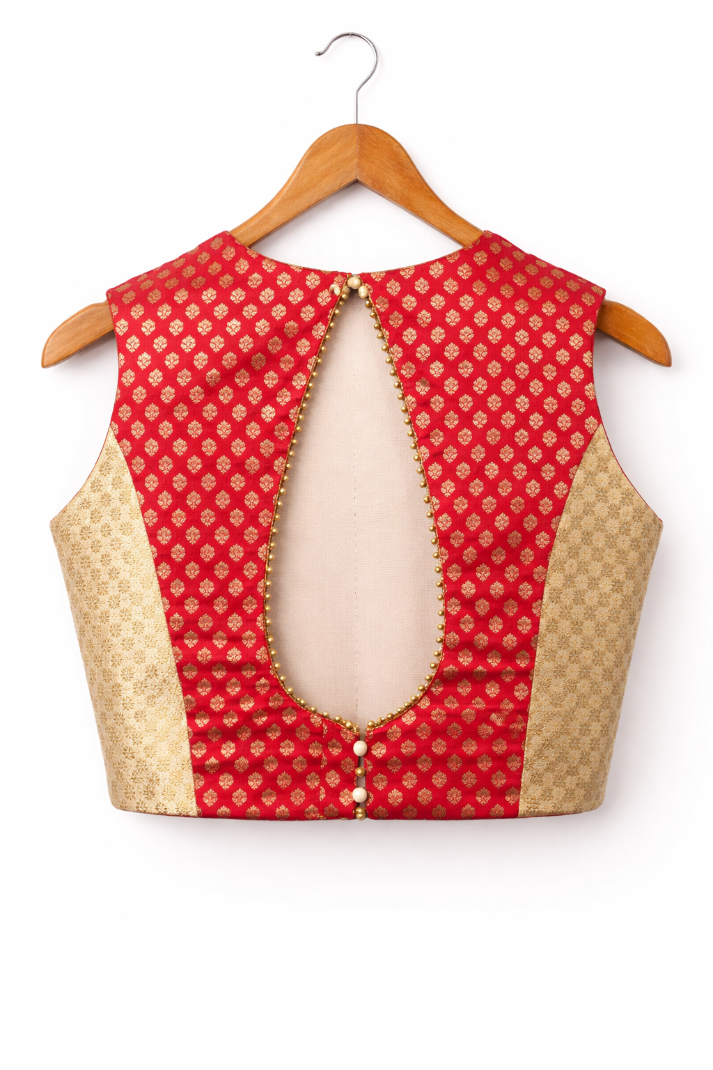 Stylish red and gold brocade blouse featuring a deep V-neckline and sleeveless cut, accentuated with delicate bead edging. The back has a bold oval cut-out with button detailing, adding a modern twist to traditional elegance.