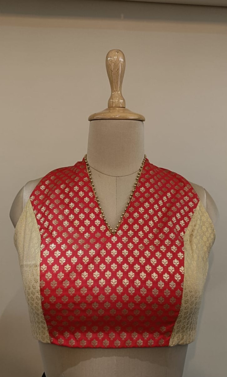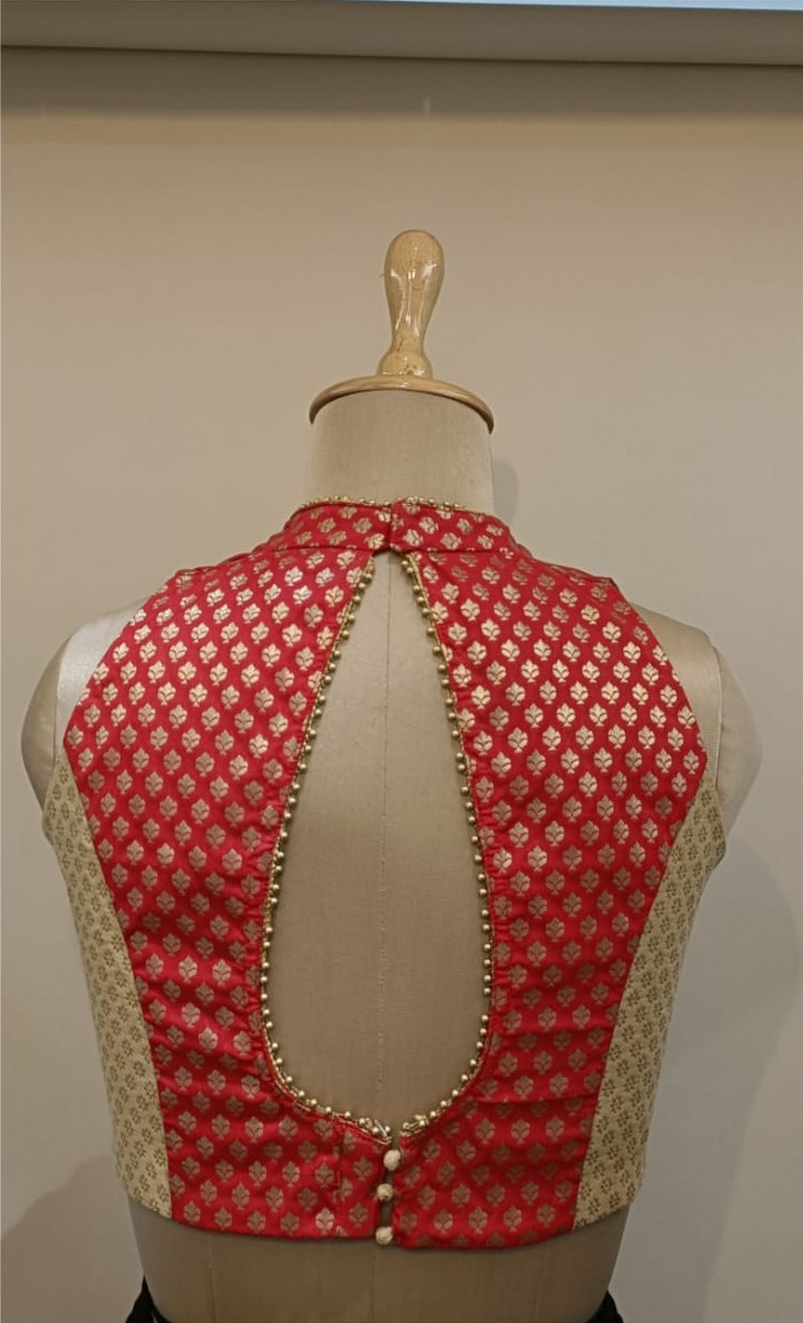 + ShippingStylish red and gold brocade blouse featuring a deep V-neckline and sleeveless cut, accentuated with delicate bead edging. The back has a bold oval cut-out with button detailing, adding a modern twist to traditional elegance.