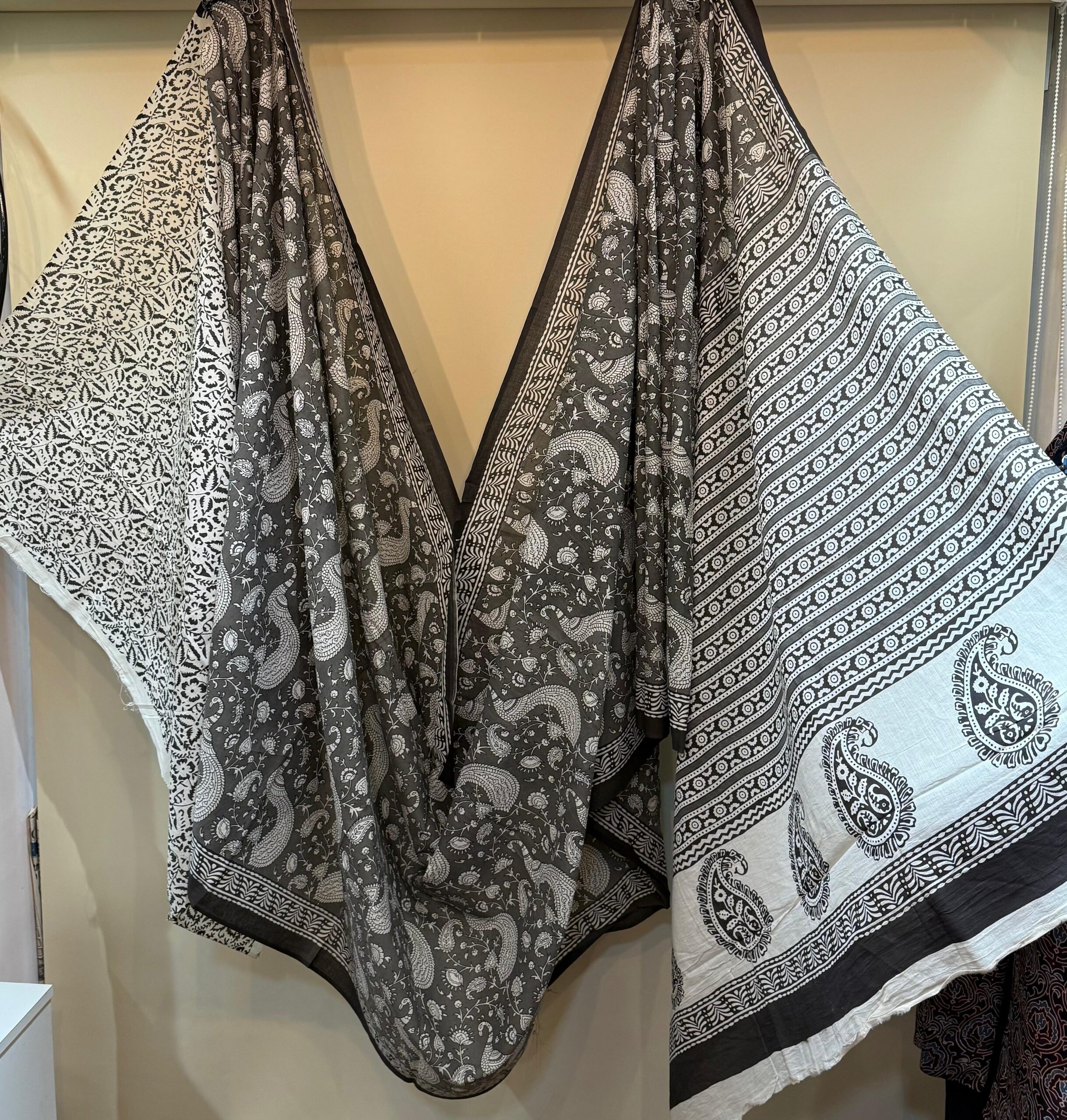 Printed Mul saree in white and black combination along with small print blouse piece.