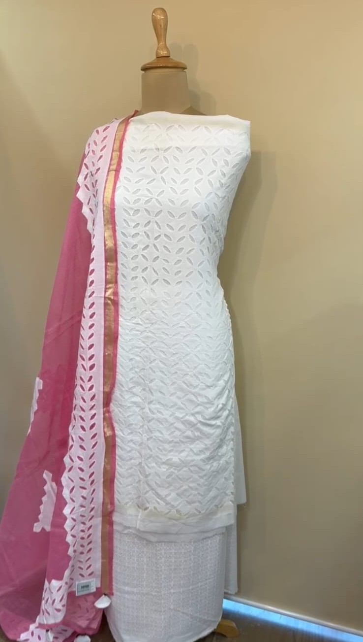 A White appliqué work kurta paired with a pink and white appliqué work dupatta, and a white plain pant.