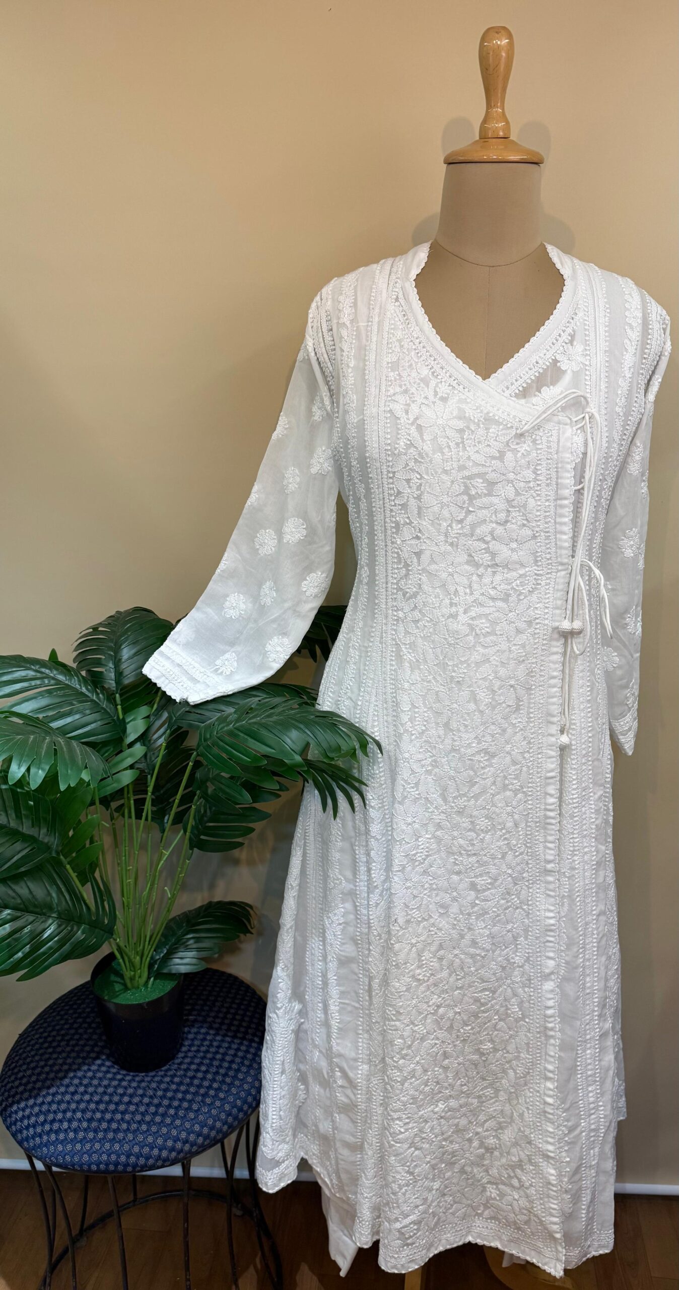 Elegant white Lucknowi angrakha, adorned with delicate chikankari embroidery and tie-up detailing. A graceful and timeless piece, perfect for festive or casual wear.