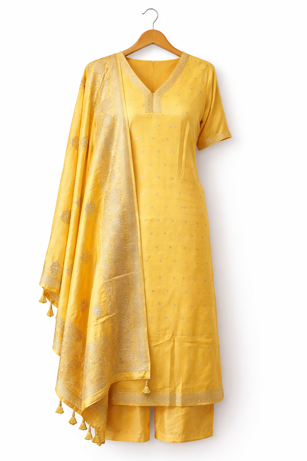 + ShippingElegant yellow silk suit set adorned with delicate zari motifs all over. The kurta features a simple V-neckline accentuated with subtle gota detailing, paired with a matching dupatta beautifully bordered with intricate zari embroidery and tassel edges. A perfect blend of grace and festive charm.
