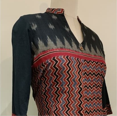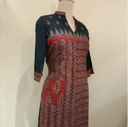 + ShippingStylish zigzag Dhabu cotton kurta featuring a black ikat yoke, contrast red detailing, and side pockets with ethnic motifs. A perfect blend of tradition and contemporary charm.